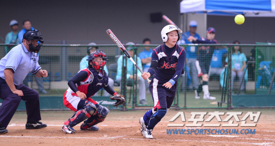 29일 오후 인천 송도LNG야구장에서 2014 인천 아시안게임 소프트볼 예선전 한국과 일본의 경기가 열렸다. 2회말 1사서 한국 최선화가 파울볼을 치고 있다.