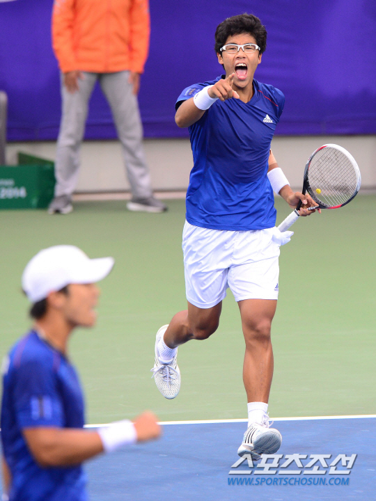 29일 인천 열우물테니스경기장에서 2014인천아시아경기대회 남자 테니스 복식 결승전 한국과 인도의 경기가 펼쳐졌다. 한국대표 임용규(23, 당진시청)-정현(18, 삼일공고)이 인도 사케즈 미네니-사남 싱 조와 금메달을 놓고 대결을 펼쳤다. 1세트를 7대5로 따낸 정현-임용규 조가 환호하고 있다.
