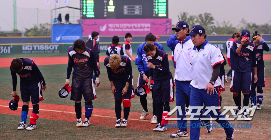 29일 오후 인천 송도LNG야구장에서 2014 인천 아시안게임 소프트볼 예선전 한국과 일본의 경기가 열렸다. 일본에 0대8로 패배한 한국 선수들이 관중들에게 인사하고 있다.