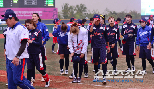 29일 오후 인천 송도LNG야구장에서 2014 인천 아시안게임 소프트볼 예선전 한국과 일본의 경기가 열렸다. 일본에 0대8로 패배한 한국 선수들이 관중들에게 인사하고 있다.