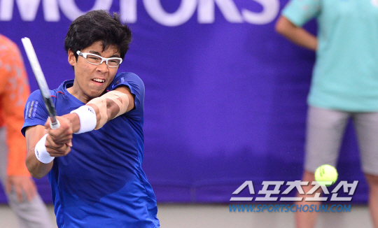 29일 인천 열우물테니스경기장에서 2014인천아시아경기대회 남자 테니스 복식 결승전 한국과 인도의 경기가 펼쳐졌다. 한국대표 임용규(23, 당진시청)-정현(18, 삼일공고)이 인도 사케즈 미네니-사남 싱 조와 금메달을 놓고 대결을 펼쳤다. 정현이 강스매싱을 선보이고 있다.