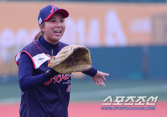 29일 오후 인천 송도LNG야구장에서 2014 인천 아시안게임 소프트볼 예선전 한국과 일본의 경기가 열렸다. 한국 양이슬이 경기 도중 환하게 웃고 있다.