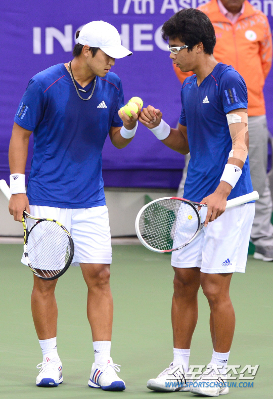 29일 인천 열우물테니스경기장에서 2014인천아시아경기대회 남자 테니스 복식 결승전 한국과 인도의 경기가 펼쳐졌다. 한국대표 임용규(23, 당진시청)-정현(18, 삼일공고)이 인도 사케즈 미네니-사남 싱 조와 금메달을 놓고 대결을 펼쳤다. 임용규(왼쪽)와 정현이 대화를 나누고 있다.