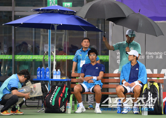 29일 인천 열우물테니스경기장에서 2014인천아시아경기대회 남자 테니스 복식 결승전 한국과 인도의 경기가 펼쳐졌다. 한국대표 임용규(23, 당진시청)-정현(18, 삼일공고)이 인도 사케즈 미네니-사남 싱 조와 금메달을 놓고 대결을 펼쳤다. 2세트 도중 비가 내리자 경기가 잠시 중단되고 있다. 정현-임용규 선수가 휴식을 취하고 있다. 정현-임용규 조는 1세트를 따내며 좋은 분위기를 이어가고 있었다.