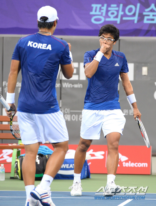 29일 인천 열우물테니스경기장에서 2014인천아시아경기대회 남자 테니스 복식 결승전 한국과 인도의 경기가 펼쳐졌다. 한국대표 임용규(23, 당진시청)-정현(18, 삼일공고)이 인도 사케즈 미네니-사남 싱 조와 금메달을 놓고 대결을 펼쳤다. 득점에 성공하자 정현과 임용규(왼쪽)가 기뻐하고 있다.