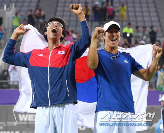 29일 인천 열우물테니스경기장에서 2014인천아시아경기대회 남자 테니스 복식 결승전 한국과 인도의 경기가 펼쳐졌다. 한국대표 임용규(23, 당진시청)-정현(18, 삼일공고)이 인도 사케즈 미네니-사남 싱 조와 금메달을 놓고 대결을 펼쳤다. 세트스코어 2대0으로 승리하며 금메달을 차지한 임용규-정현이 태극기를 들고 세리머니를 펼치고 있다.