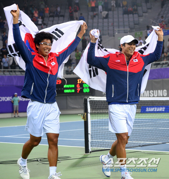 29일 인천 열우물테니스경기장에서 2014인천아시아경기대회 남자 테니스 복식 결승전 한국과 인도의 경기가 펼쳐졌다. 한국대표 임용규(23, 당진시청)-정현(18, 삼일공고)이 인도 사케즈 미네니-사남 싱 조와 금메달을 놓고 대결을 펼쳤다. 세트스코어 2대0으로 승리하며 금메달을 차지한 임용규-정현이 태극기를 들고 세리머니를 펼치고 있다.