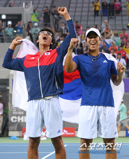 29일 인천 열우물테니스경기장에서 2014인천아시아경기대회 남자 테니스 복식 결승전 한국과 인도의 경기가 펼쳐졌다. 한국대표 임용규(23, 당진시청)-정현(18, 삼일공고)이 인도 사케즈 미네니-사남 싱 조와 금메달을 놓고 대결을 펼쳤다. 세트스코어 2대0으로 승리하며 금메달을 차지한 임용규-정현이 태극기를 들고 세리머니를 펼치고 있다.