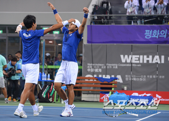 29일 인천 열우물테니스경기장에서 2014인천아시아경기대회 남자 테니스 복식 결승전 한국과 인도의 경기가 펼쳐졌다. 한국대표 임용규(23, 당진시청)-정현(18, 삼일공고)이 인도 사케즈 미네니-사남 싱 조와 금메달을 놓고 대결을 펼쳤다. 세트스코어 2대0으로 승리하며 금메달을 차지한 임용규-정현이 우승이 확정되자 감격스러워 하고 있다.