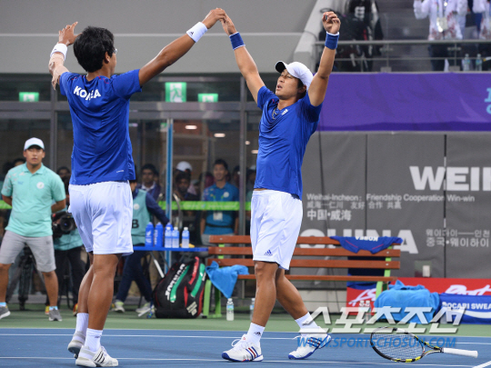 29일 인천 열우물테니스경기장에서 2014인천아시아경기대회 남자 테니스 복식 결승전 한국과 인도의 경기가 펼쳐졌다. 한국대표 임용규(23, 당진시청)-정현(18, 삼일공고)이 인도 사케즈 미네니-사남 싱 조와 금메달을 놓고 대결을 펼쳤다. 세트스코어 2대0으로 승리하며 금메달을 차지한 임용규-정현이 우승이 확정되자 감격스러워 하고 있다.