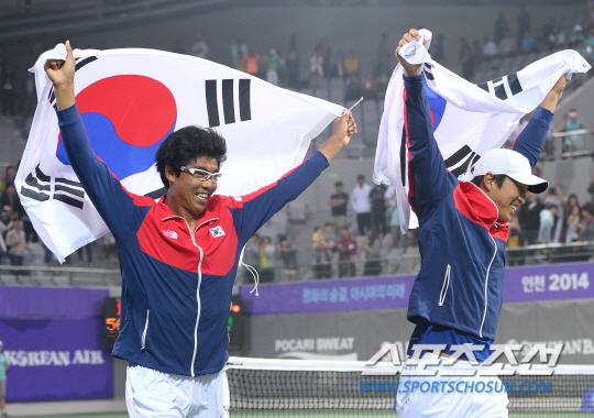 29일 인천 열우물테니스경기장에서 2014인천아시아경기대회 남자 테니스 복식 결승전 한국과 인도의 경기가 펼쳐졌다. 한국대표 임용규(23, 당진시청)-정현(18, 삼일공고)이 인도 사케즈 미네니-사남 싱 조와 금메달을 놓고 대결을 펼쳤다. 세트스코어 2대0으로 승리하며 금메달을 차지한 임용규-정현이 태극기를 들고 세리머니를 펼치고 있다.