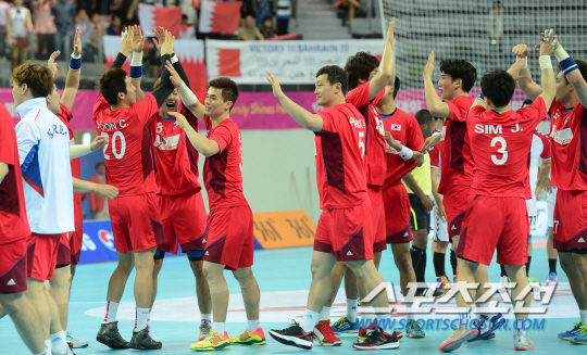 인천아시안게임 남자 핸드볼 한국과 바레인의 준결승전이 29일 인천 선학체육관에서 열렸다. 바레인을 27-23으로 꺾은 한국 선수들이 환호하고 있다.