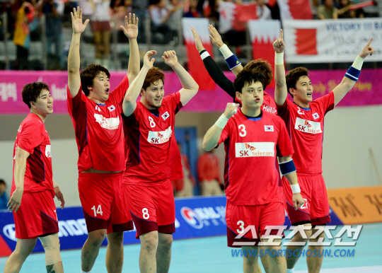 인천아시안게임 남자 핸드볼 한국과 바레인의 준결승전이 29일 인천 선학체육관에서 열렸다. 바레인을 27-23으로 꺾은 한국 선수들이 환호하고 있다.