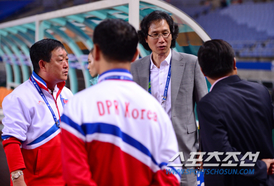 29일 오후 인천 문학경기장에서 2014 인천 아시안게임 축구 남자 한국과 북한의 경기가 열렸다. 경기 전 최순호 대한축구협회 부회장이 북한 관계자와 이야기를 나누고 있다.
