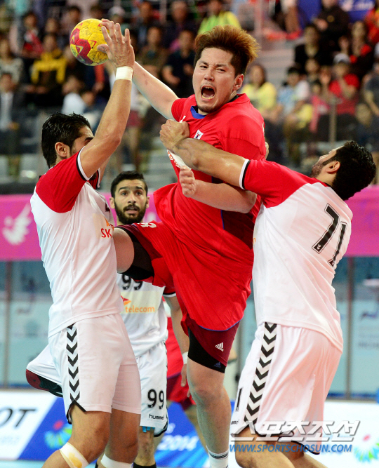 인천아시안게임 남자 핸드볼 한국과 바레인의 준결승전이 29일 인천 선학체육관에서 열렸다. 공격을 성공시킨 한국 박중규가 바레인 수비수 두 명을 뚫고 슛을 성공시키고 있다.