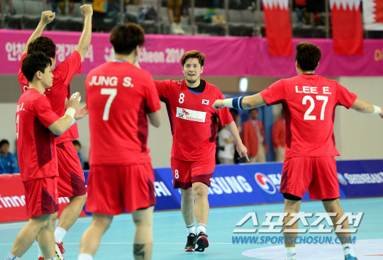 인천아시안게임 남자 핸드볼 한국과 바레인의 준결승전이 29일 인천 선학체육관에서 열렸다. 바레인을 27-23으로 꺾은 한국 선수들이 환호하고 있다.
