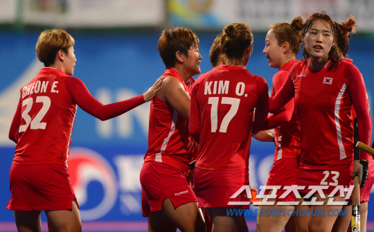 29일 인천 선학하키경기장에서 2014인천아시아경기대회 여자하키 준결승 경전 한국과 인도의 경기가 펼쳐졌다. 3쿼터 박미현(왼쪽 두 번째)이 추가골을 성공시키고 동료들과 함께 기뻐하고 있다.