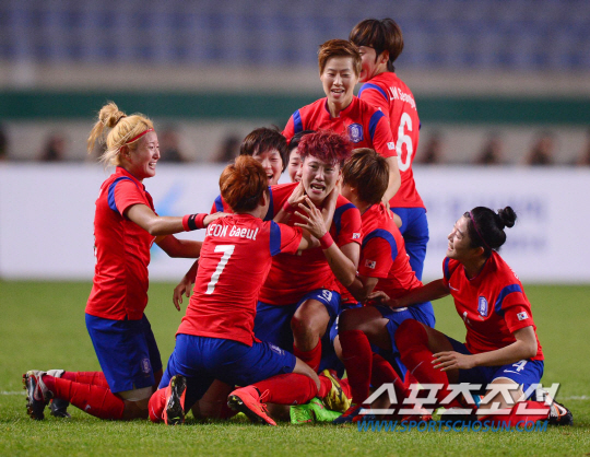 29일 오후 인천 문학경기장에서 2014 인천 아시안게임 축구 여자 한국과 북한의 경기가 열렸다. 전반 선취골을 성공시킨 한국 정설빈이 동료들과 환호하고 있다.