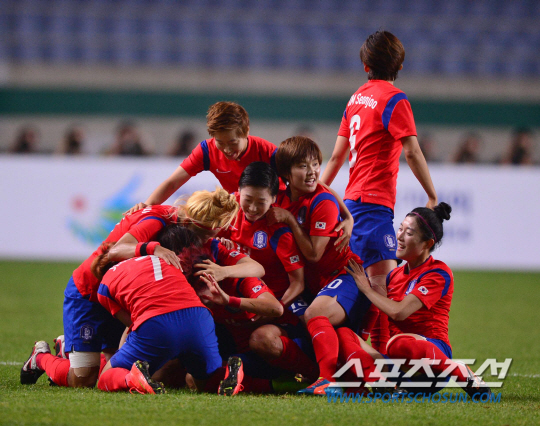 29일 오후 인천 문학경기장에서 2014 인천 아시안게임 축구 여자 한국과 북한의 경기가 열렸다. 전반 선취골을 성공시킨 한국 정설빈이 지소연 등 동료들과 환호하고 있다.