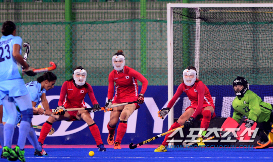 29일 인천 선학하키경기장에서 2014인천아시아경기대회 여자하키 준결승 경전 한국과 인도의 경기가 펼쳐졌다. 4쿼터 페널티킥을 허용한 상황에서 한국 선수들이 온 몸으로 수비하고 있다.