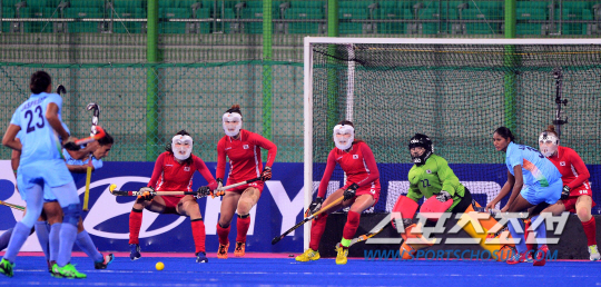29일 인천 선학하키경기장에서 2014인천아시아경기대회 여자하키 준결승 경전 한국과 인도의 경기가 펼쳐졌다. 4쿼터 페널티킥을 허용한 상황에서 한국 선수들이 온 몸으로 수비하고 있다.