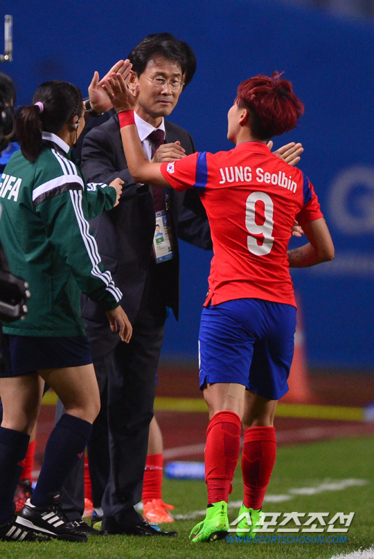 29일 오후 인천 문학경기장에서 2014 인천 아시안게임 축구 여자 한국과 북한의 경기가 열렸다. 전반 선취골을 성공시킨 한국 정설빈이 윤덕여 감독과 환호하고 있다.