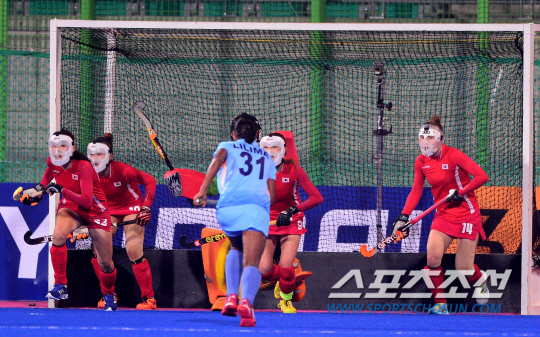 29일 인천 선학하키경기장에서 2014인천아시아경기대회 여자하키 준결승 경전 한국과 인도의 경기가 펼쳐졌다. 4쿼터 페널티킥을 허용한 상황에서 한국 선수들이 온 몸으로 수비하고 있다.