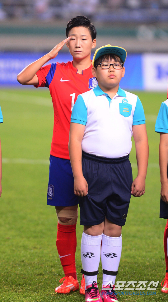 29일 오후 인천 문학경기장에서 2014 인천 아시안게임 축구 여자 한국과 북한의 경기가 열렸다. 경기 전 한국 권하늘이 거수 경례를 하고 있다.