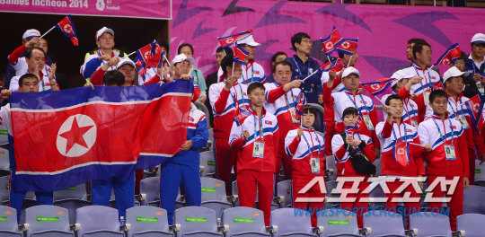 29일 오후 인천 문학경기장에서 2014 인천 아시안게임 축구 여자 한국과 북한의 경기가 열렸다. 경기장을 찾은 북한 응원단이 응원을 하고 있다.
