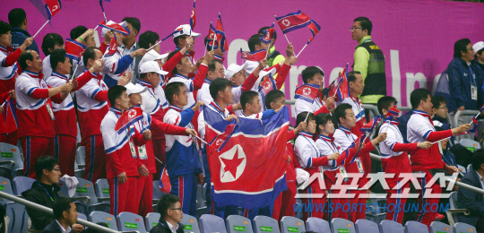 29일 오후 인천 문학경기장에서 2014 인천 아시안게임 축구 여자 한국과 북한의 경기가 열렸다. 경기장을 찾은 북한 응원단이 응원을 하고 있다.