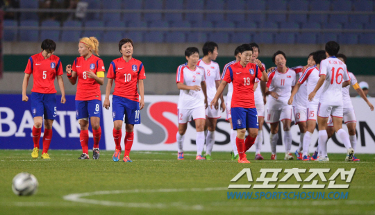 29일 오후 인천 문학경기장에서 2014 인천 아시안게임 축구 여자 한국과 북한의 경기가 열렸다. 전반 북한 리예경에게 동점골을 허용한 한국 지소연 등 선수들이 아쉬워하고 있다.