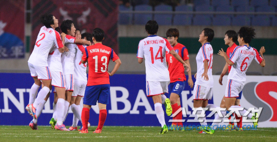 29일 오후 인천 문학경기장에서 2014 인천 아시안게임 축구 여자 한국과 북한의 경기가 열렸다. 전반 북한 리예경이 동료들과 환호하고 있다.