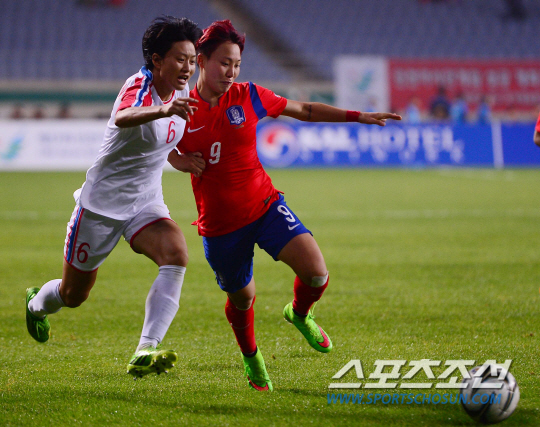 29일 오후 인천 문학경기장에서 2014 인천 아시안게임 축구 여자 한국과 북한의 경기가 열렸다. 한국 정설빈(오른쪽)이 북한 김은향과 볼을 다투고 있다.