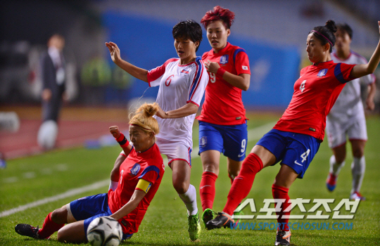 29일 오후 인천 문학경기장에서 2014 인천 아시안게임 축구 여자 한국과 북한의 경기가 열렸다. 한국 최소현(맨 외쪽)이 북한 김은향에 앞서 볼을 걷어내고 있다.