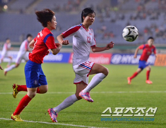 29일 오후 인천 문학경기장에서 2014 인천 아시안게임 축구 여자 한국과 북한의 경기가 열렸다. 북한 김윤미(오른쪽)가 한국 김도연에 앞서 슈팅을 시도하고 있다.