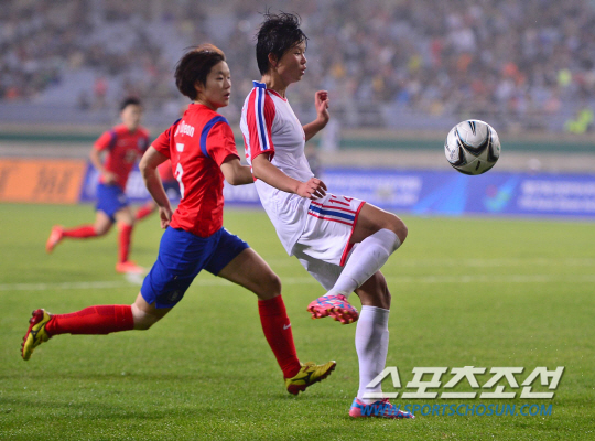 29일 오후 인천 문학경기장에서 2014 인천 아시안게임 축구 여자 한국과 북한의 경기가 열렸다. 북한 김윤미(오른쪽)가 한국 김도연에 앞서 슈팅을 시도하고 있다.