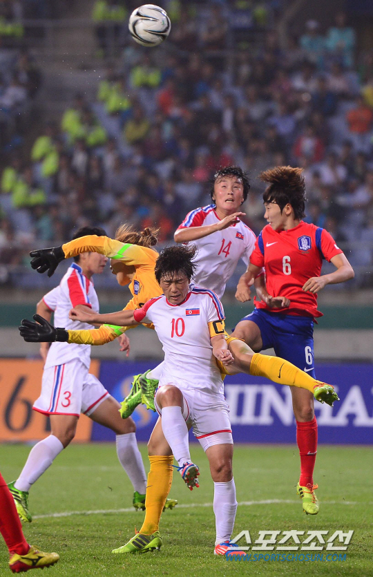 29일 오후 인천 문학경기장에서 2014 인천 아시안게임 축구 여자 한국과 북한의 경기가 열렸다. 한국 김혜리가 볼을 쳐내고 있다.