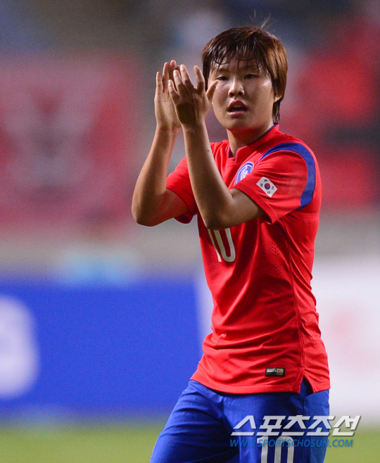 29일 오후 인천 문학경기장에서 2014 인천 아시안게임 축구 여자 한국과 북한의 경기가 열렸다. 한국 지소연이 동료들에게 박수를 보내고 있다.