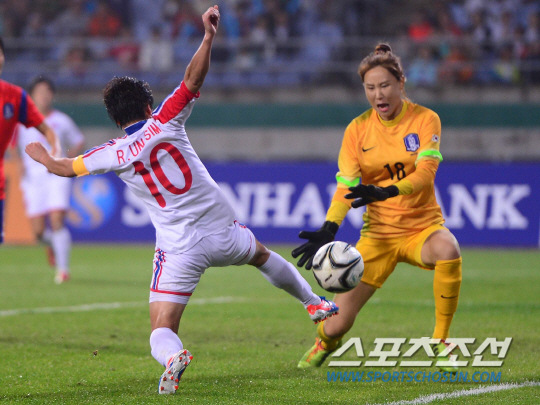 29일 오후 인천 문학경기장에서 2014 인천 아시안게임 축구 여자 한국과 북한의 경기가 열렸다. 한국 김정미 GK가 북한 라은심의 공격을 막아내고 있다.