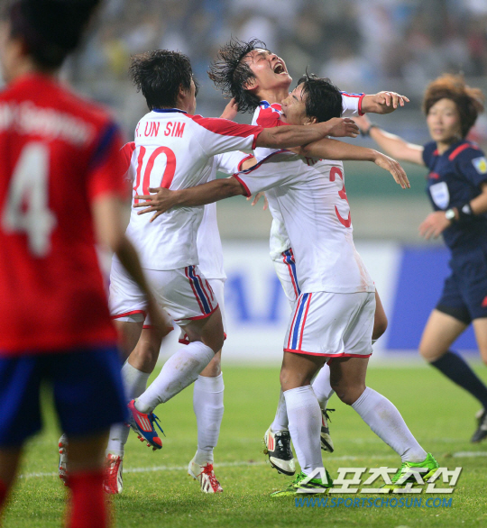 29일 오후 인천 문학경기장에서 2014 인천 아시안게임 축구 여자 한국과 북한의 경기가 열렸다. 종료 직전 역전골을 성공시킨 북한 호은별(맨 오른쪽)이 동료들과 환호하고 있다.