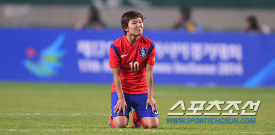29일 오후 인천 문학경기장에서 2014 인천 아시안게임 축구 여자 한국과 북한의 경기가 열렸다. 경기가 끝난 후 지소연이 아쉬워하고 있다.
