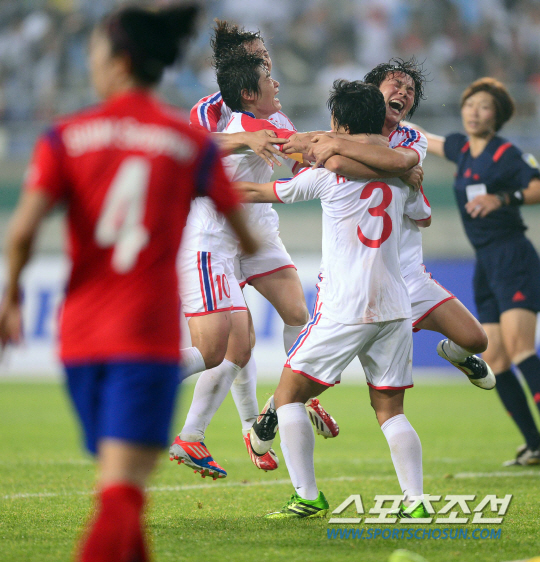 29일 오후 인천 문학경기장에서 2014 인천 아시안게임 축구 여자 한국과 북한의 경기가 열렸다. 종료 직전 역전골을 성공시킨 북한 허은별이 동료들과 환호하고 있다.