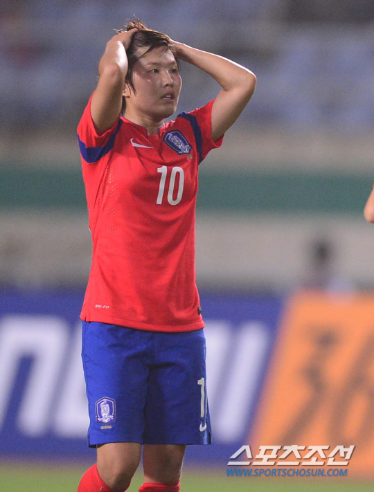 29일 오후 인천 문학경기장에서 2014 인천 아시안게임 축구 여자 한국과 북한의 경기가 열렸다. 북한에 패배하며 결승행이 좌절된 한국 지소연이 아쉬워하고 있다.