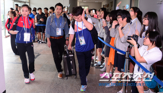 30일 오후 인천 서운고등학교 체육관에서 2014 인천 아시안게임 한국 리듬체조 선수들의 훈련이 열렸다. 손연재가 학생들의 환호를 받으며 체육관에 들어서고 있다.