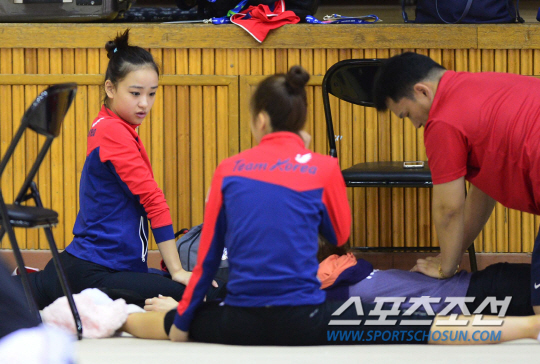 30일 오후 인천 서운고등학교 체육관에서 2014 인천 아시안게임 한국 리듬체조 선수들의 훈련이 열렸다. 손연재가 가볍게 몸을 풀고 있다.