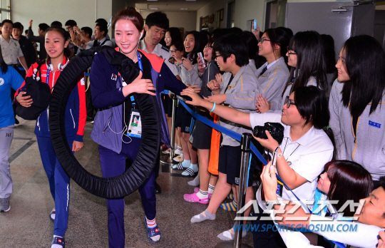 30일 오후 인천 서운고등학교 체육관에서 2014 인천 아시안게임 한국 리듬체조 선수들의 훈련이 열렸다. 김윤희가 학생들의 환호를 받으며 입장하고 있다.