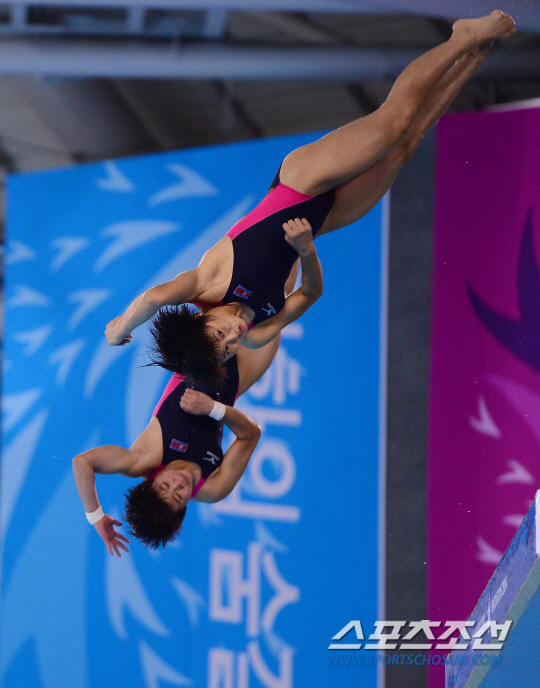 30일 오후 인천 문학박태환수영장에서 2014 인천 아시안게임 여자 다이빙 싱크로나이즈 10m 플랫폼 경기가 열렸다. 북한 김은향-송남향이 멋진 연기를 펼치고 있다.