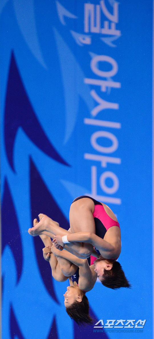 30일 오후 인천 문학박태환수영장에서 2014 인천 아시안게임 여자 다이빙 싱크로나이즈 10m 플랫폼 경기가 열렸다. 북한 김은향-송남향이 멋진 연기를 펼치고 있다.