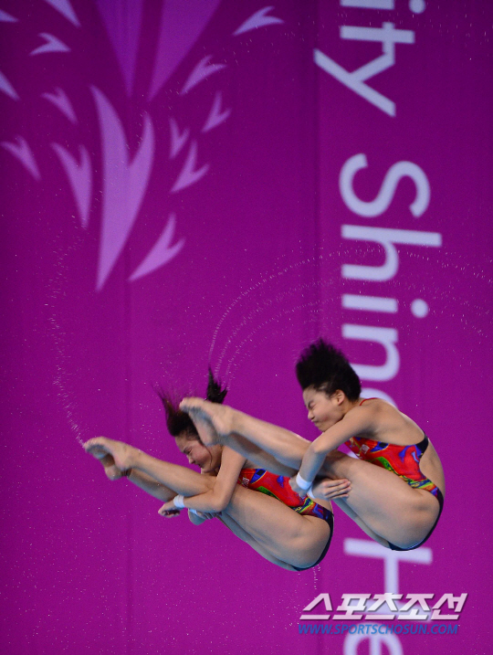 30일 오후 인천 문학박태환수영장에서 2014 인천 아시안게임 여자 다이빙 싱크로나이즈 10m 플랫폼 경기가 열렸다. 중국 첸 뤄린과 류 후이시아과 리우가 멋진 연기를 펼치고 있다.