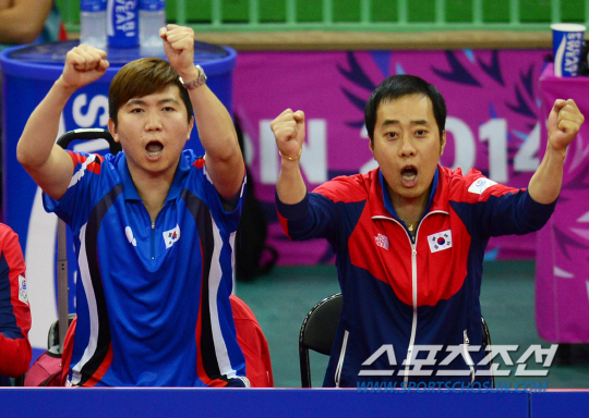 인천아시안게임 탁구 남자 단체전 한국(주세혁, 정상은, 이정우, 김동현)과 중국(쉬신, 판전둥, 마룽, 장지커)의 결승전이 30일 수원실내체육관에서 열렸다. 유남규 감독(오른쪽)과 유승민 코치가 주세혁이 점수를 올리자 환호하고 있다.
